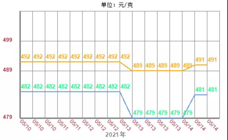 2021年05月14日11:00:国际黄金回收价格1823.75美元/盎司,国内黄金典当价格379.69元/克,香港金价19490港币/两,黄金回收价格374元/克,中国黄金抵押基础金价379.69元/克,周大福黄金典当价格491元/克(较昨日涨2元),六福黄金回收价格491元/克(较昨日涨2元),周生生黄金抵押价格491元/克(较昨日涨1元),老凤祥黄金典当价格493元/克(较昨日持平),老庙黄金回收价格490元/克(较昨日涨1元),菜百黄金抵押价格482元/克(较昨日持平)...(仅参考)
