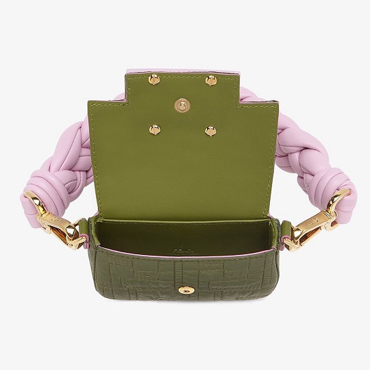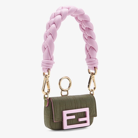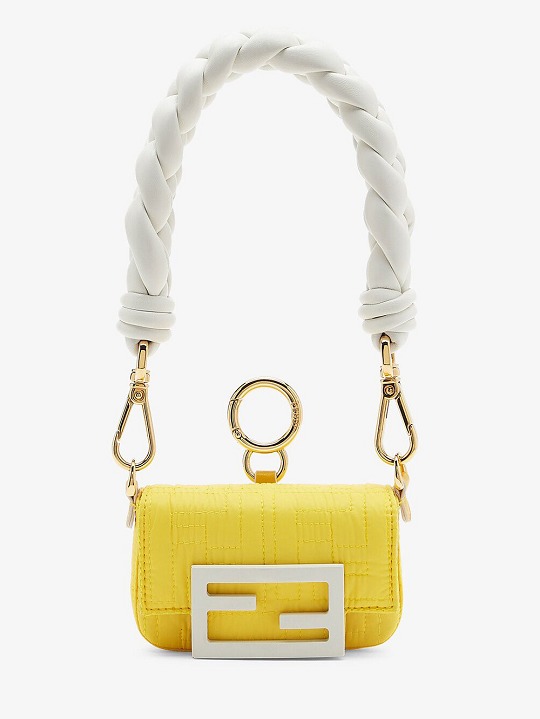 Fendi (芬迪)迷你吊饰包袖珍包包依然受宠,Nano Baguette 吊饰包本季焕以 FF 绗缝尼龙材质登场,搭配糖果色纳帕皮革编织提手,大提手和小包包形成一种反差萌感。