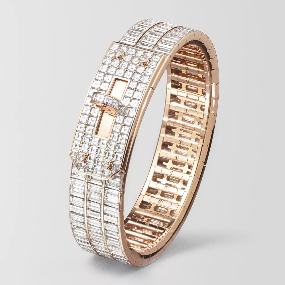 Kelly Baguettes 玫瑰金手镯,by Hermès镶嵌长阶梯形切割、方形切割和圆形切割钻石。