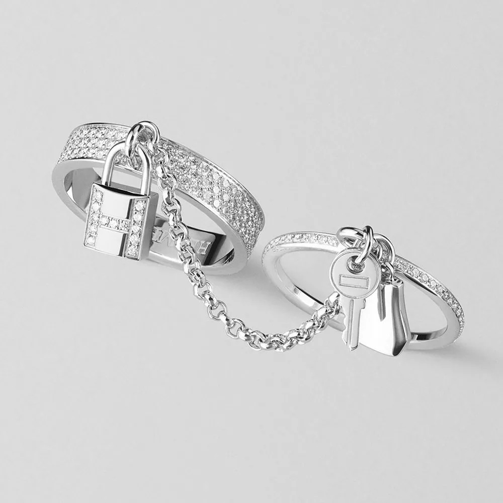 【首饰鉴定回收15251823366】Double Kelly Clochette 白金指间戒,by Hermès镶嵌圆形切割钻石。