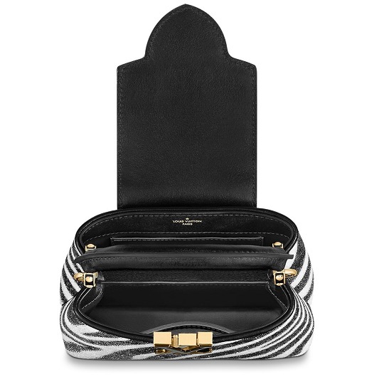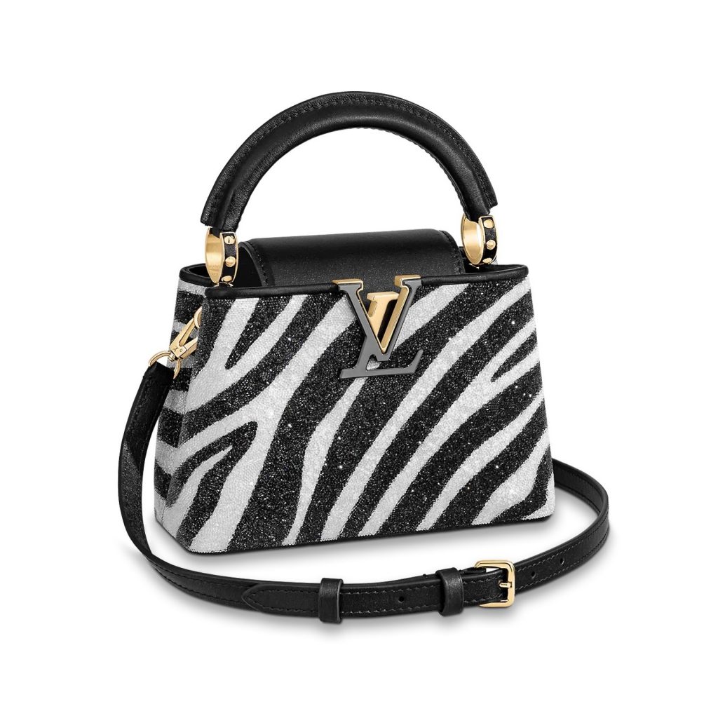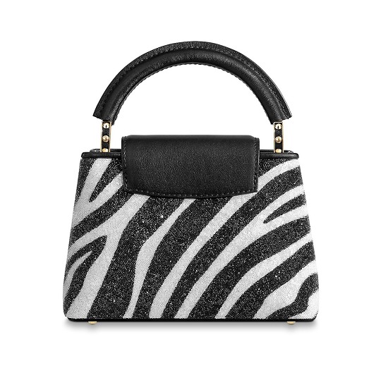 最出彩的是这只斑马纹 Capucines,取材黑色小牛皮为背景,通过手工镶嵌施华洛世奇水晶打造出斑马纹理,黑白撞色显得又酷又精致。