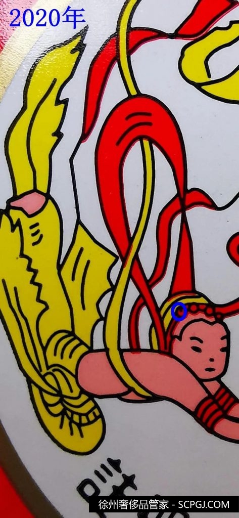 2020年真酒飞天标左边仙女头部第一个圆圈内有小黑点,而2016年真酒这点不明显。