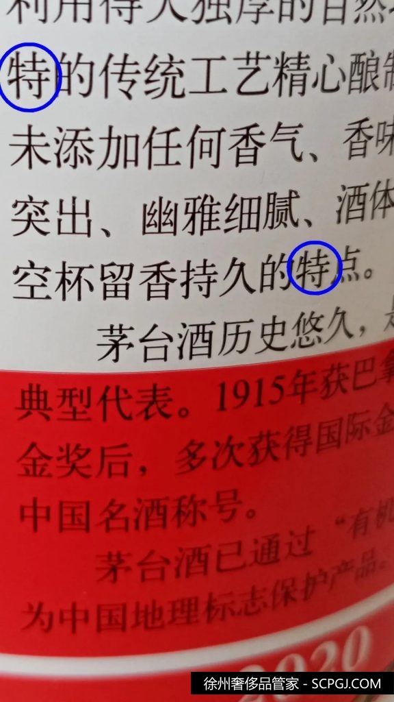 2016年真酒背标文字中,独特的“特”字“寸”的点与横分开,特点的“特”字“寸”的点与横相连。而2020年真酒这点刚好相反,独特的“特”字“寸”的点与横相连,特点的“特”字“寸”的点与横分开。