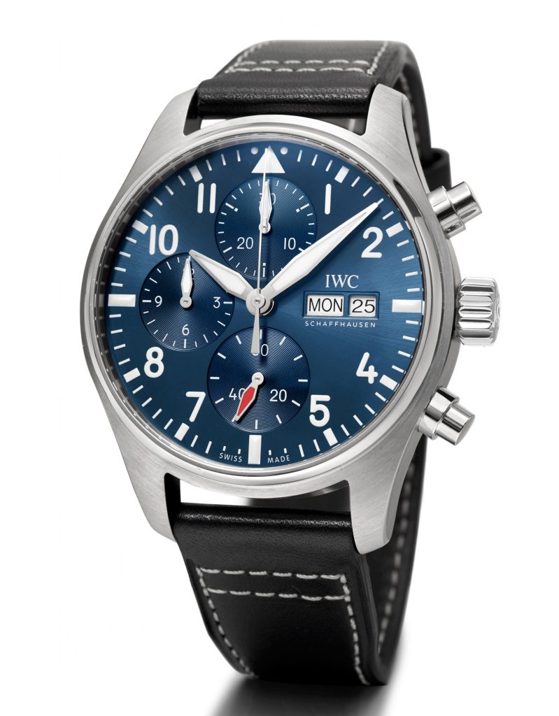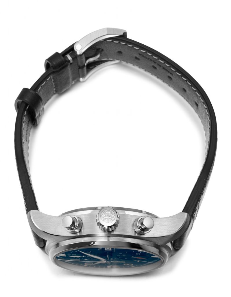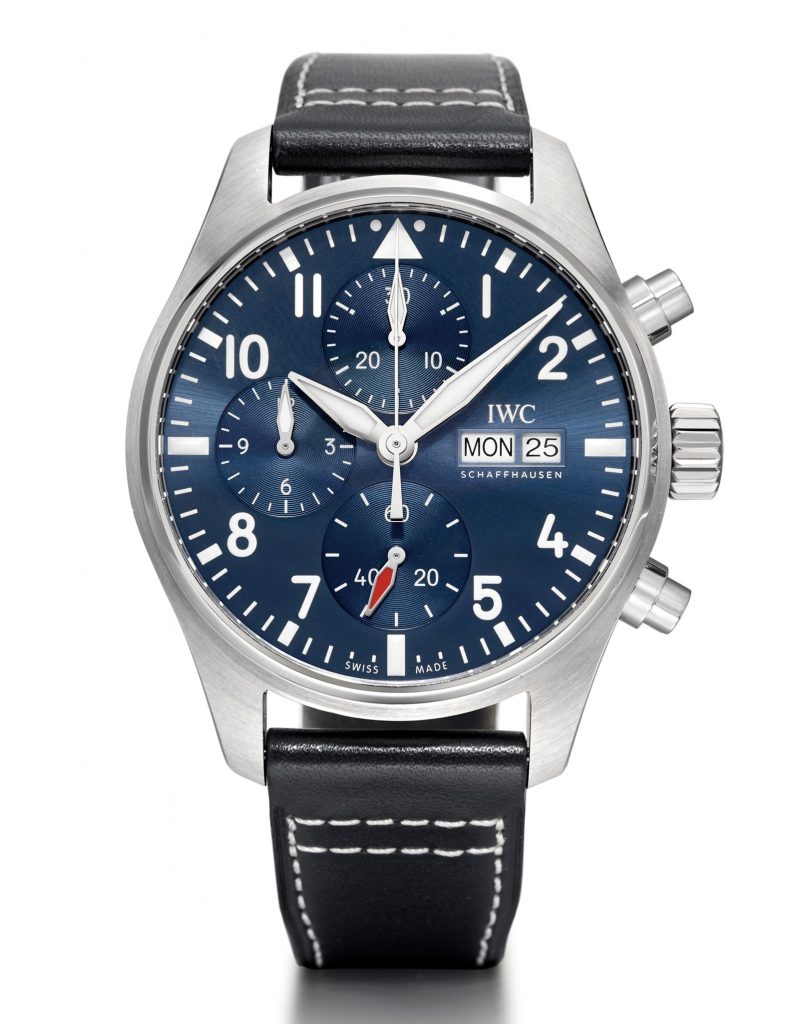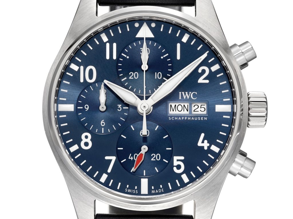 IWC 万国典当回收图鉴 Pilot’s Watch Chronograph 飞行员计时腕表41毫米精钢表壳,直径41mm,厚度14.5mm,蓝宝石水晶表镜表背,旋入式表冠,蓝色表盘,镀铑指针,IWC 69385 自动上链机芯,33石,摆频28800vph,动力存储46小时,小牛皮表带,防水100米。复杂功能:计时码表