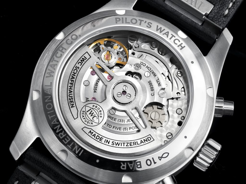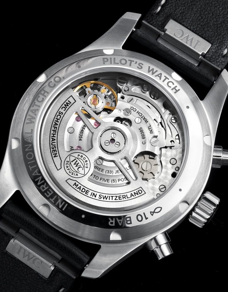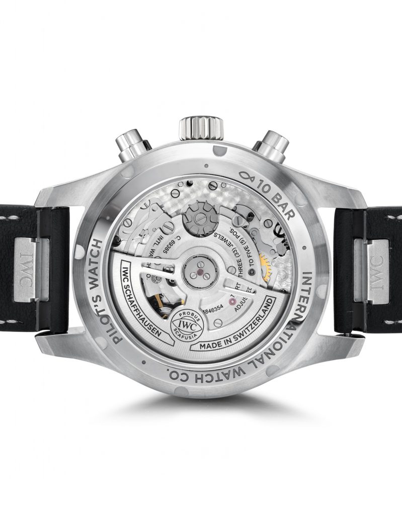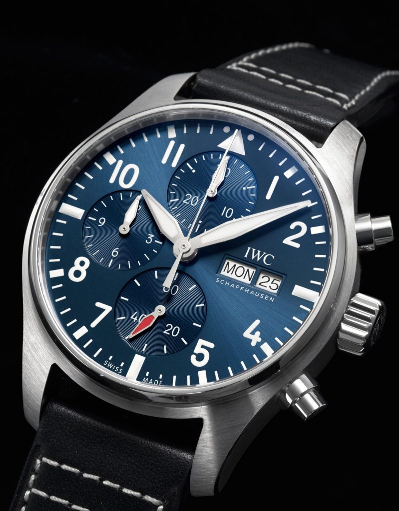 IWC 万国典当回收图鉴 Pilot’s Watch Chronograph 飞行员计时腕表41毫米精钢表壳,直径41mm,厚度14.5mm,蓝宝石水晶表镜表背,旋入式表冠,蓝色表盘,镀铑指针,IWC 69385 自动上链机芯,33石,摆频28800vph,动力存储46小时,小牛皮表带,防水100米。复杂功能:计时码表