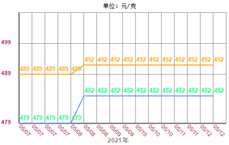2021年05月12日10:14:国际黄金回收价格1830.55美元/盎司,国内黄金典当价格380.05元/克,香港金价19580港币/两,黄金回收价格375元/克,中国黄金抵押基础金价380.05元/克,周大福黄金典当价格492元/克(较昨日持平),六福黄金回收价格492元/克(较昨日持平),周生生黄金质押价格492元/克(较昨日涨1元),老凤祥黄金典当价格493元/克(较昨日持平),老庙黄金抵押价格493元/克(较昨日涨1元),菜百黄金置换价格482元/克.(较昨日持平)..(仅参考)