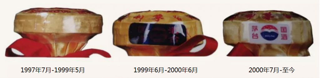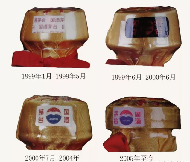 茅台30年、50年份酒瓶口处有明显防伪标记,99年开始采用深蓝色防伪标贴,00年7月至今用的是上海天臣防伪标贴。