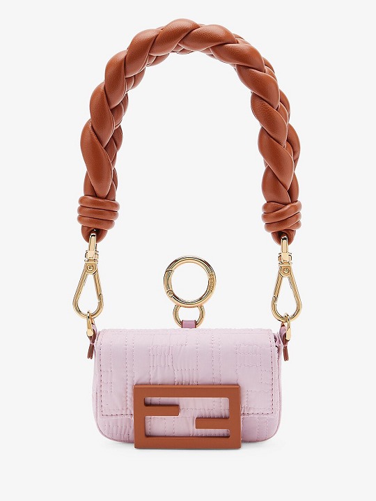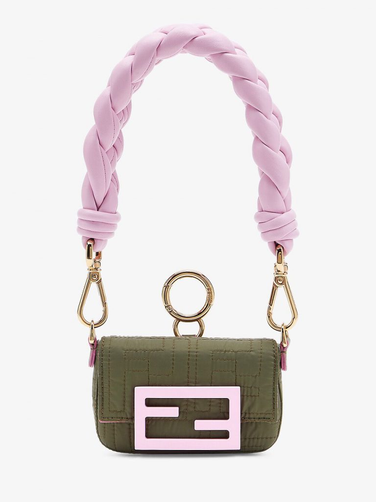Fendi (芬迪)迷你吊饰包袖珍包包依然受宠,Nano Baguette 吊饰包本季焕以 FF 绗缝尼龙材质登场,搭配糖果色纳帕皮革编织提手,大提手和小包包形成一种反差萌感。