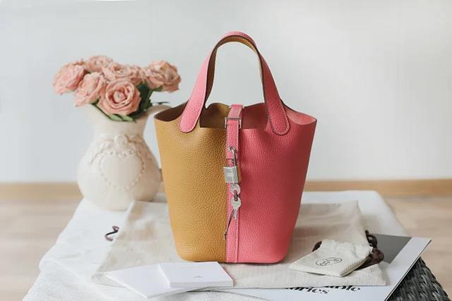 【爱马仕鉴定回收15251823366】Hermes/爱马仕Picotin Lock芝麻色/唇膏粉拼色银扣菜篮子水桶女包回收价格查询