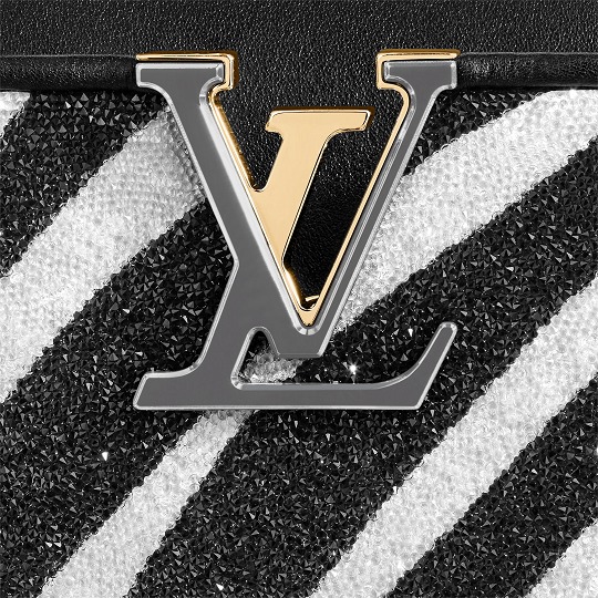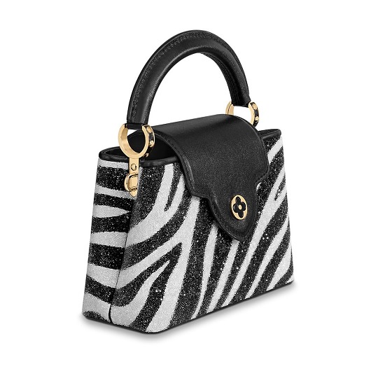 最出彩的是这只斑马纹 Capucines,取材黑色小牛皮为背景,通过手工镶嵌施华洛世奇水晶打造出斑马纹理,黑白撞色显得又酷又精致。