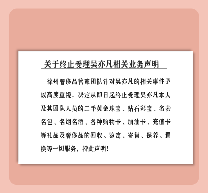 徐州奢侈品管家关于终止回收吴亦凡二手奢侈品相关业务的声明 发表评论 27,322 次浏览 A+所属分类:黄金回收 徐州奢侈品管家投资人团队针对吴亦凡的相关事件予以高度重视,决定从即日起终止受理吴亦凡本人及其团队人员的二手黄金珠宝、钻石彩宝、名表名包、名烟名酒、各种购物卡、加油卡、充值卡等礼品及奢侈品的回收、鉴定、寄售、保养、置换等一切服务,特此声明! 这是我的微信 可以发图在线询价,或者直接拨打电话:152-5182-3366/199-7519-7817咨询预约上门回收。