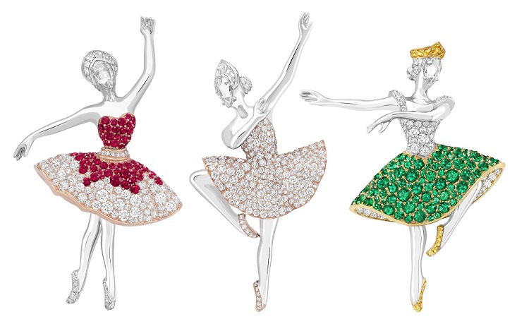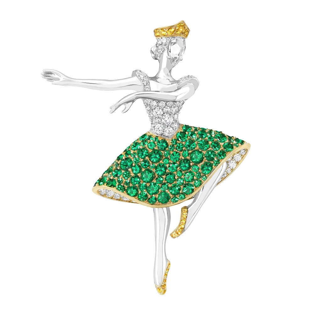 Camille Ballerina 白金胸针回收价格查询,by Van Cleef & Arpels芭蕾舞伶面部镶嵌一颗水滴形玫瑰式切割钻石,点缀圆形切割祖母绿、黄色蓝宝石和钻石。
