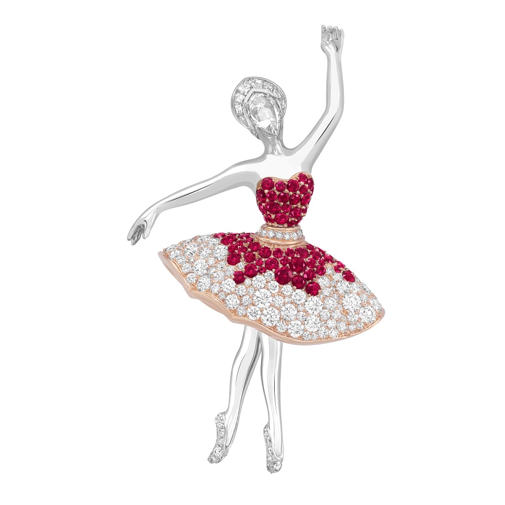 Albertine Ballerina 白金胸针回收价格查询,by Van Cleef & Arpels芭蕾舞伶面部镶嵌一颗水滴形玫瑰式切割钻石,点缀圆形切割红宝石,阶梯型切割和圆形切割钻石。