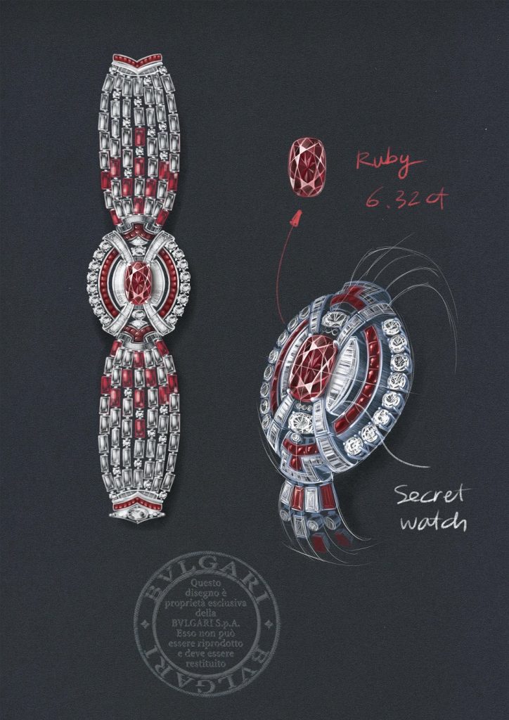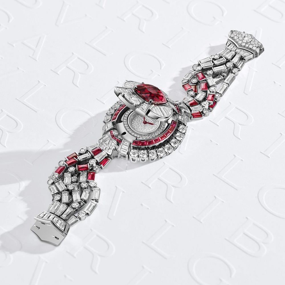 宝格丽Ruby Metamorphosis 高级珠宝腕表,by BVLGARI铂金表壳,主石为一颗6.32ct的枕形切割红宝石,产自莫桑比克,点缀弧面切割红宝石和阶梯形切割钻石,搭载石英机芯。宝格丽Ruby Metamorphosis 高级珠宝腕表回收抵押典当价格高吗?