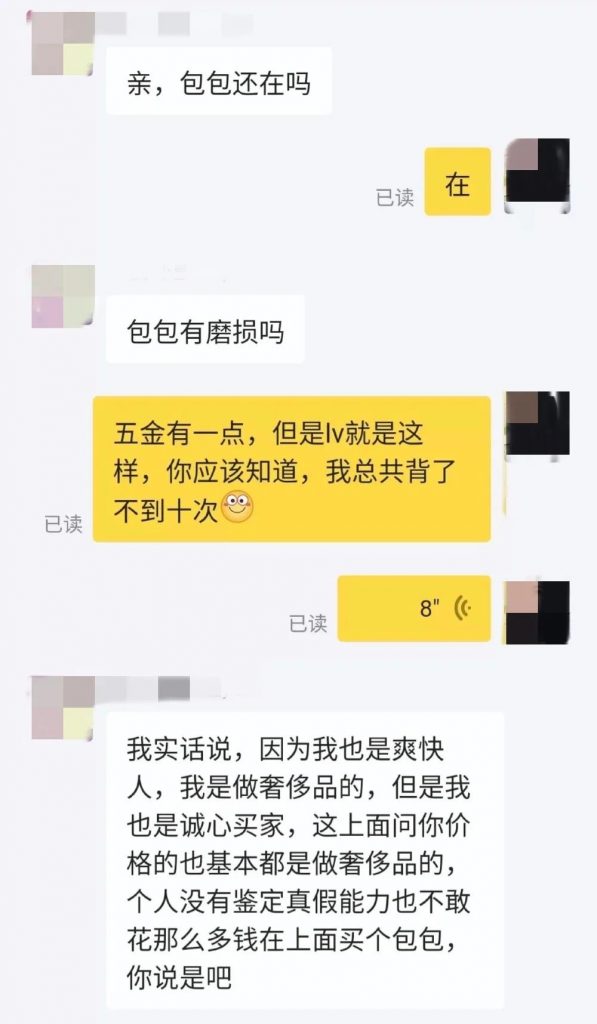 我在闲鱼上被一个号称做奢侈品回收的买家骗了,却无法维权! 发表评论 2,960,188 次浏览 A+所属分类:名牌包回收 奢侈品小知识 大家好,我是小嘉,没想到我第一次投稿居然是来曝光骗局,我是在闲鱼上被一个号称做奢侈品回收的买家骗的,这我才知道原来骗子在闲鱼上赚钱这么简单。 事情是这样的,我男朋友去年圣诞给我买了一个LV蒙田包,我当时很感动啊,直男能送这种礼物真的用心了。 但是背了几次我就发现不适合我啊,我是小个子,背着这款有点大,而且有点重,东西稍微装多一点就好沉,所以妥妥的,包包被我闲置了。 你们知道的,今年疫情嘛大家都没赚到什么钱,我也一样,所以这不就打起了闲置的主意,打算把家里的闲置出一出。 说实话我之前没玩儿过闲鱼,刚开始我先从护肤品囤货卖起,本来没抱太大希望,但没想到卖得都还不错,很快就出完了囤货。 一些售出的闲置 接着我就开始卖包包,先后挂了三个闲置的包,蒙田是其中一个。原本以为卖包像卖护肤品一样简单,没想到这次卖包真的让我涨姿势了。 包挂在闲鱼上几天就有不少人来问,蒙田这个最火,可能因为女孩子们都被各种电视剧电影洗脑吧,觉得一定要有一个LV。 但真正下单的根本就没有,还有一上来就对半砍价的,我真的开了眼,一万七买来的包,闲置出8k,讲价一上来就是2k出不出,这种人我都不想回复。 终于挂出去一周的时候,有一个靠谱的卖家来询问了,她比较专业,一上来先确定了成色,然后说自己是做二手奢侈品的来收包,知道行情,要7200收。 我不太相信还加了她的微信,发现确实是做二手奢侈品的,接下来我们也在微信上聊了蛮多。 因为我也是第一次卖贵重物品,所以听她这么说觉得蛮靠谱,就按她的要求拍了各种角度图片视频,也同意了7200的价格,想着卖给专业懂行的人总归安心些没啥幺蛾子,万万没想到这才是幺蛾子的开始。 她在闲鱼上拍下后我本来是要发顺丰到付,但因为她比较急我第二天约顺丰时候顺丰要下午6点多才能来,所以我急匆匆发了个中通,我知道贵重物品要留心所以还特地在包的手柄出贴了小纸条起一个防盗扣的作用。 寄出后我本来觉得这件事就结束了我安心等待钱到账就好。但就在快递到达后,她突然在微信上和我说,包是假的,她拒收了,申请了退款。 我当时就觉得不对,怎么可能是假包,我男朋友虽然不富裕,但还不至于送我个假包,更何况专柜小票盒子什么的都在。 我让她给我拍一下她拒收的视频以及我当时手柄上的小纸条,她让我问快递员要,我去哪里找他们那边的快递员呢? 不过我当时想的是既然她不识货那也没关系,退回来就行了我再慢慢卖呗,所以我也没想太多就说等包到了再说吧。 不过这次拒收的快递也是真的漂了好久,我寄过去只要三天退回来整整花了一周,在这期间买家一直催我退款,我一直催快递快点给我退回。 终于我在自动退款前一天拿到了我的包,这一看我就傻眼了,整个盒子变形,接口处全烂,我以为是暴力快递,没想到打开包,包根本不是我的,防盗纸条也没有了,确实寄回来的就是个假包!!! 我当时火气就上来了!去和她说,让她解释为什么寄回来的包不是我寄出的那一个。而她只让我和快递沟通尽快给她退款,视频一直说自己有,但就是不发。 我真的太气了,一般这种情况不应该赶紧给我提供她的证据么?怎么还和我讨价还价上了。 后面我当然是拒绝了退款,我要求走小法庭她不愿意,没办法走了闲鱼客服介入。 但你们都懂得闲鱼处理纠纷都会偏向买家,所以我被判输了,我真的心态崩了,我来投稿就是想问,这是所谓的公平么? 买家还微信和我说结果已定,很是耀武扬威的样子,接着就拉黑了我! 你们知道的走客服介入就是提供一些照片证据,我的好多视频都没办法上传,而且客服判定了买家胜,我虽然说我会维权,但事实上我已经不知道用什么办法继续维权了。 而且我后来才了解到,闲鱼上很多这样的职业骗子,空手套白狼,大几千上万的包包奢侈品一套操作下来免费到手,转手一出,那真的赚翻了吧! 我确实没有什么二手平台交易的经验,就当花钱买教训,但这个教训我一定要发出来让大家都看清楚别再上当!同时希望更多被骗的小伙伴一起投稿曝光各种奢侈品回收骗子,也感谢徐州奢侈品管家鉴定评估回收中心实体店帮我发声。 这是我的微信 可以发图在线询价,或者直接拨打电话:152-5182-3366/199-7519-7817咨询预约上门回收。