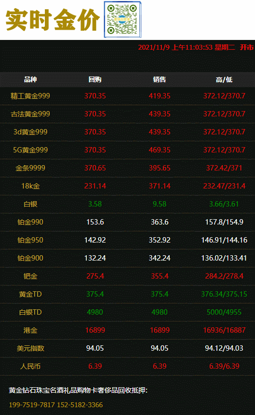 2021年11月9日#徐州奢侈品管家#金价早知道:周一,受美元下跌提振,金价升至两个月最高水平,现货黄金创9月7日以来新高至1826.49美元/盎司。台湾黄金刚刚刺穿61000.00台两/台币关口,最新报60998.00台两/台币,日图跌0.33%;香港黄金刚刚刺穿16900.00港元/司马两关口,最新报16899.00港元/司马两,日图跌0.05%; 截至11月8日ishares Gold Trust黄金持有量495.67吨,较上一交易日减少0.65吨;