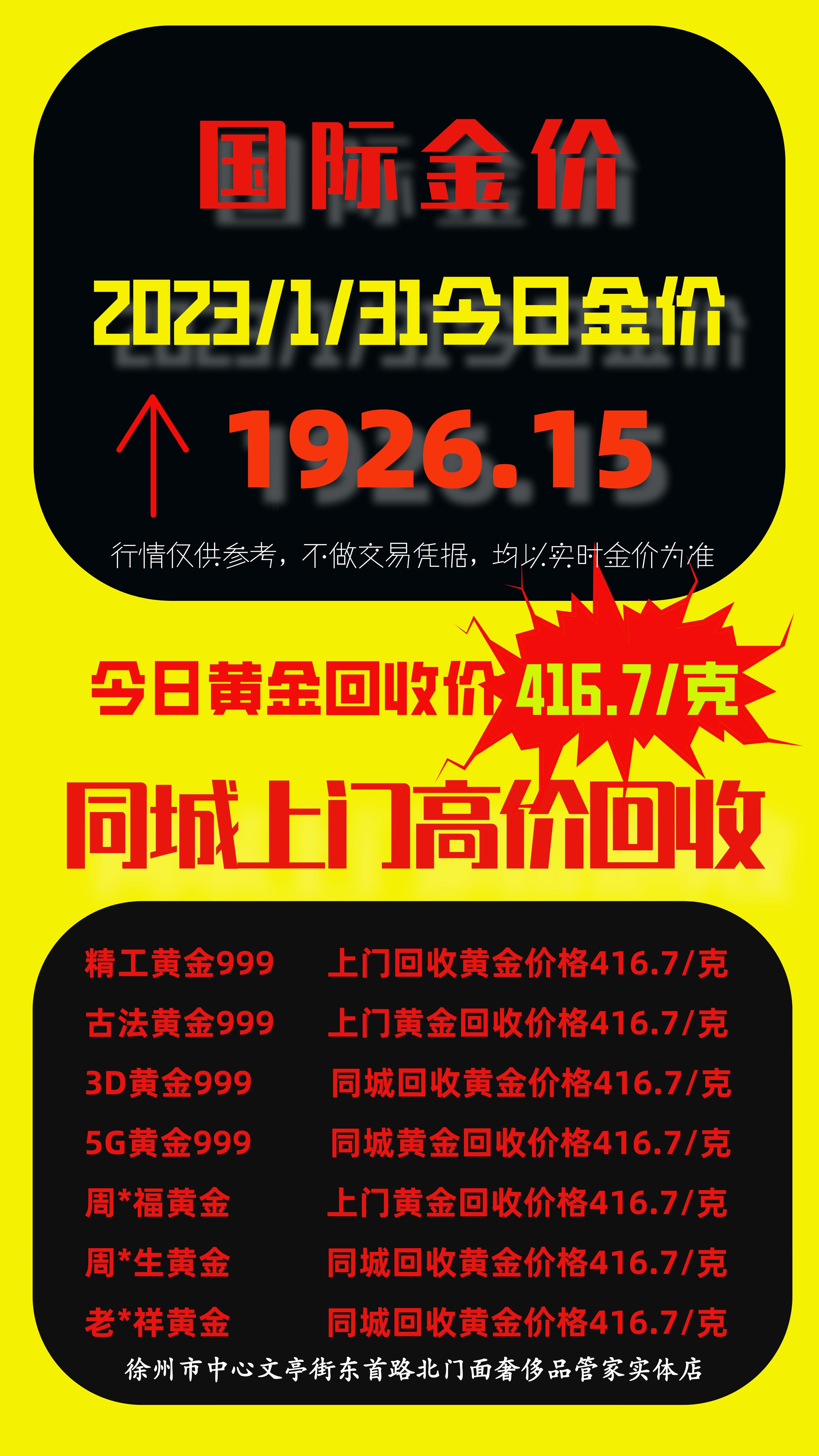 周二(1月31日)今日徐州萧县回收典当抵押黄金价格多少钱一克? 发表评论 30,961 次浏览 A+所属分类:黄金回收 周二(1月31日)今日徐州萧县回收典当抵押黄金价格多少钱一克?1月31日亚洲时段,现货黄金窄幅震荡,目前交投于1922美元附近。周一现货黄金回收价格收跌0.28%,报1923.06美元。本周美联储利率决议对金价走势非常重要,如果释放鹰派信号,金价恐回调。 这是我的微信 可以发图在线询价,或者直接拨打电话:152-5182-3366/199-7519-7817咨询预约上门回收。