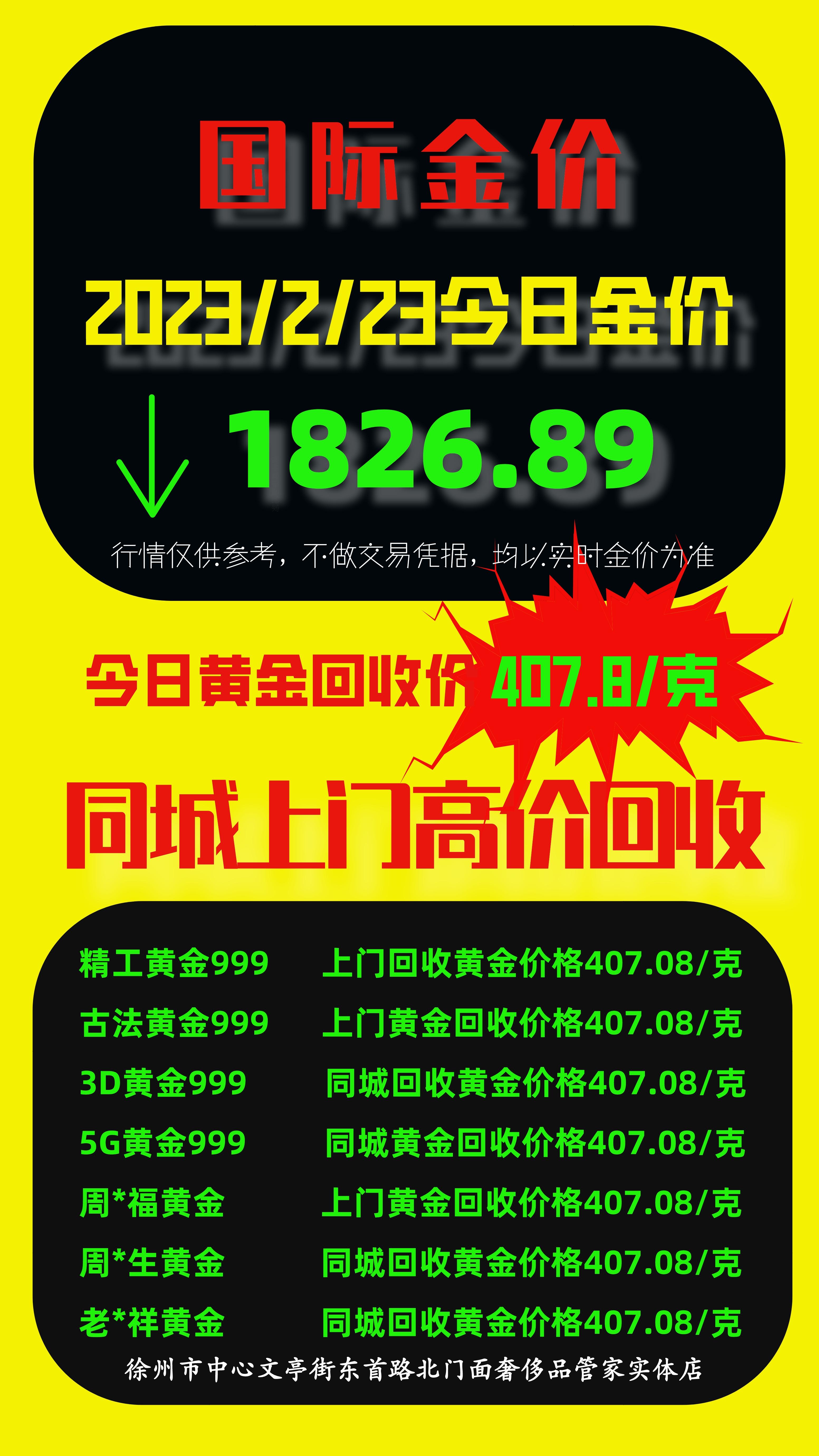 周四(2月23日)今日徐州萧县淮北永城回收典当抵押黄金价格多少钱一克?徐州黄金回收价格低位窄幅震荡,目前交投于1827.70美元/盎司附近;隔夜金价下跌0.5%,失守1830关口,一度跌至1823附近,因为强化进一步加息信号,会议纪要也显示,决策者支持更多的加息以抑制通胀后,美元继续震荡走高,逼近上周触及的近一个半月高点,对徐州回收黄金价格打压明显。